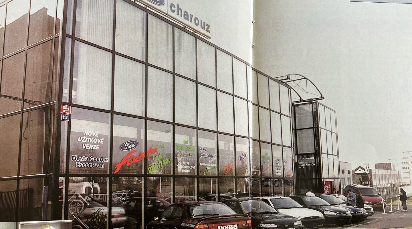 Autosalon FORD CHAROUZ, sídlící v Černokostelecké ulici v Praze, rok 1997.