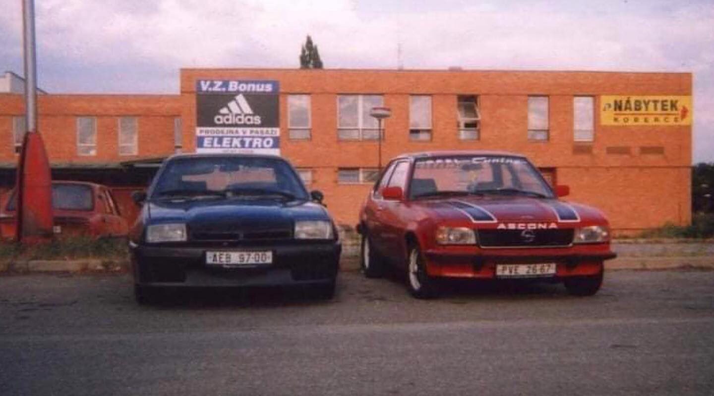 OPEL ASCONA B (coupé) a OPEL MANTA B nebyly nijak nezvyklým jevem na našich silnicích. Červená ASCONA byla registrována v okresu Prostějov, červená MANTA B také a černá MANTA B v Praze. Fotografie byly pořízeny okolo roku 1996.