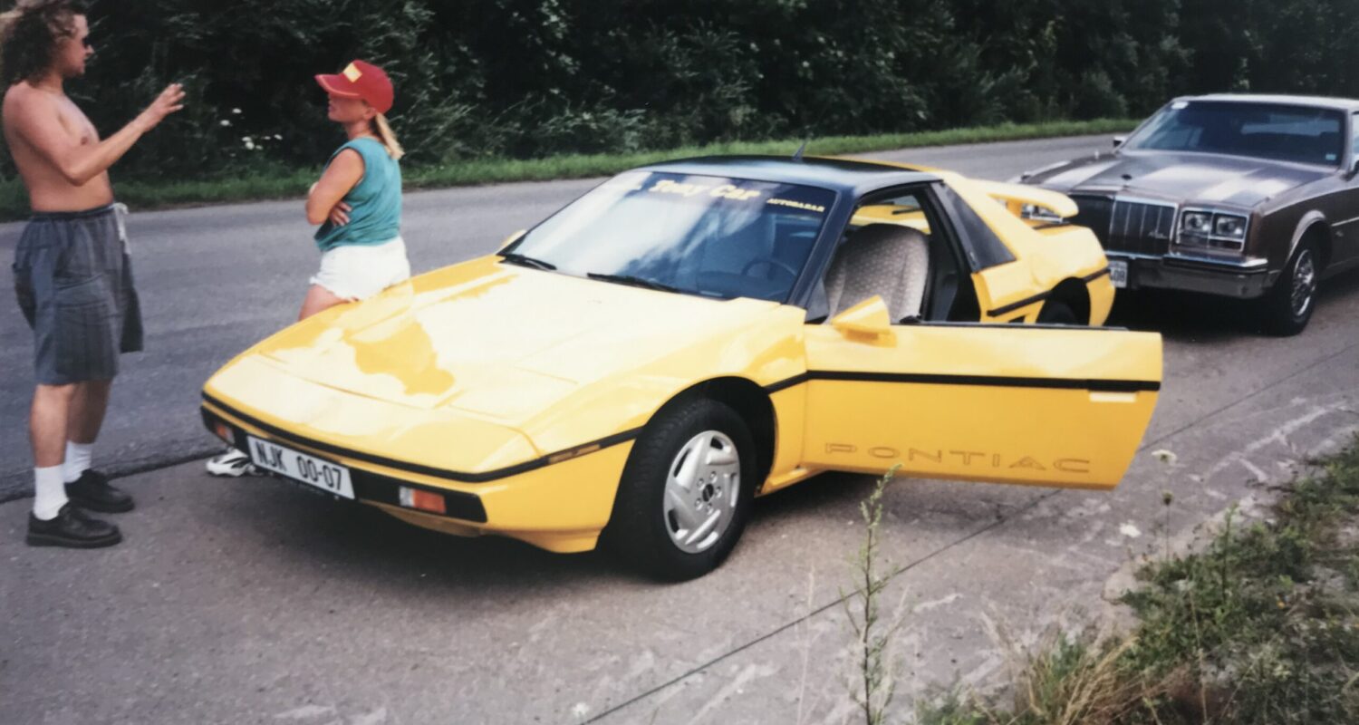 Paní Malá, opírající se o zářivě žlutý PONTIAC FIERO, je spolu se svým manželem majitelkou místního autobazaru Tony Car v Kopřivnici.